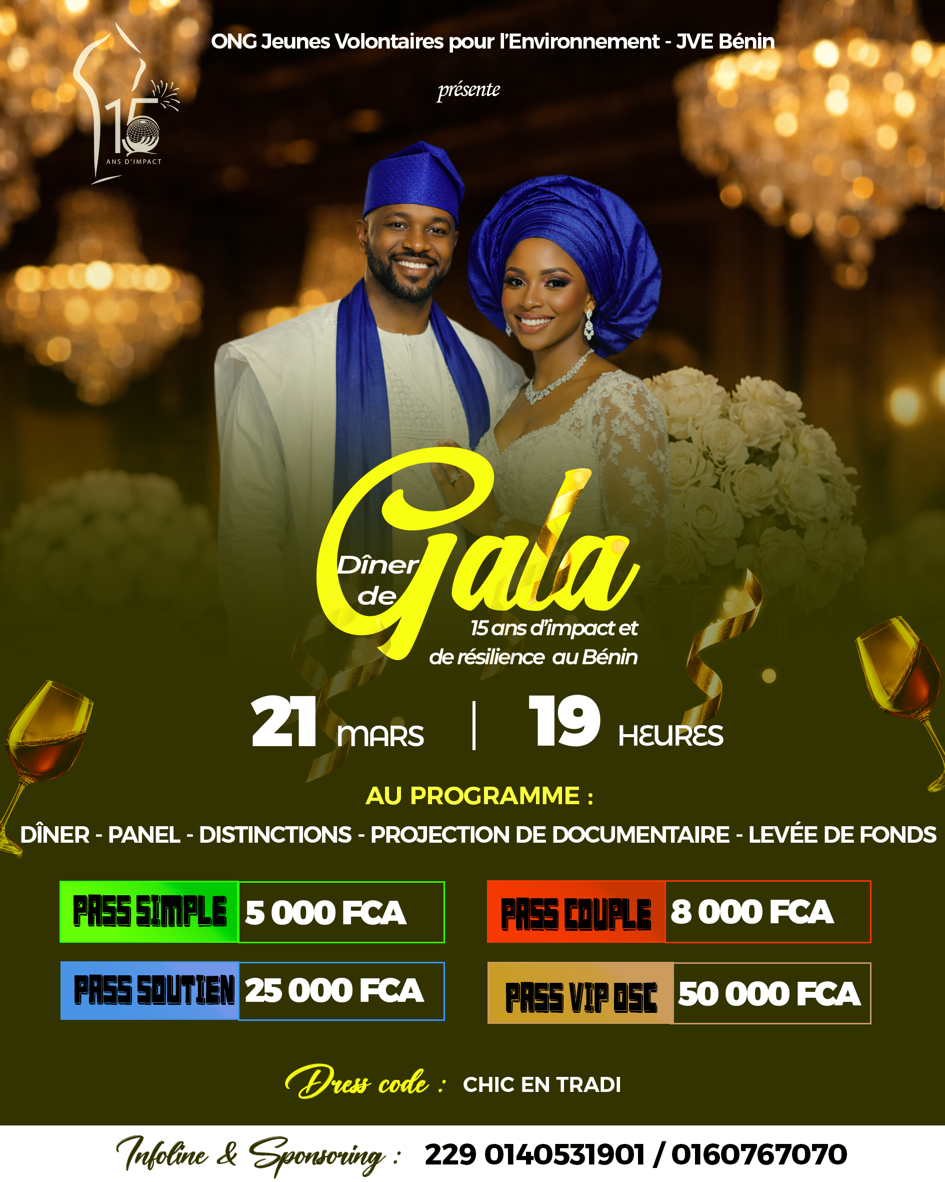 Venez prendre votre pass et participer nombreux à ce dîner de gala dédié à la célébration des 15 ans d'existence de l'ONG Jeunes Volontaires pour l'Environnement (JVE Bénin). Habillez-vous chic en Tradi et venez avec votre bonne humeur pour communier avec nous.